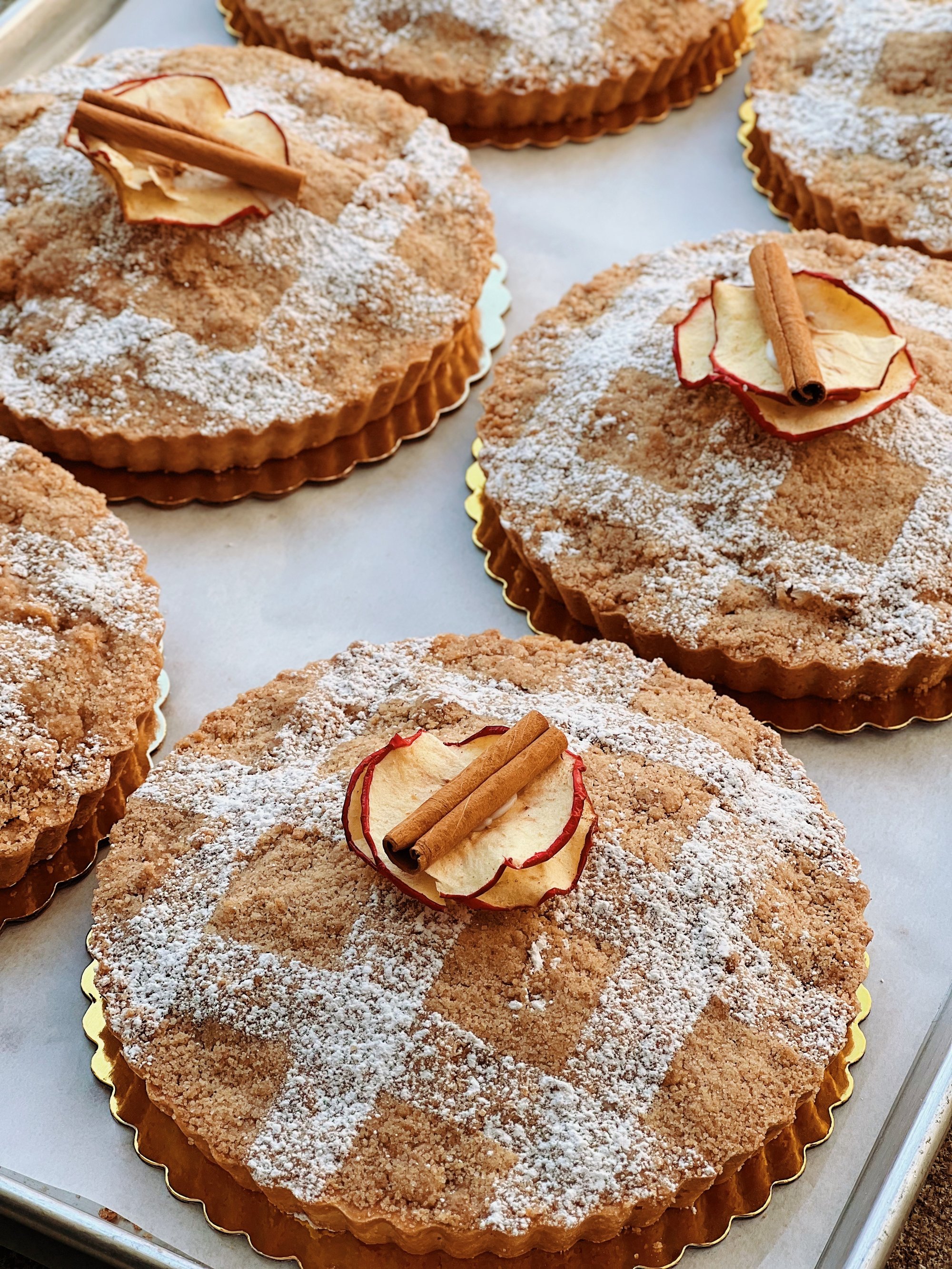 - One 8-inch apple crumb pie. Almond sablé tart shell, spiced apple pie filling, cinnamon streusel crumb, sugar lattice, dried apple slices & cinnamon.