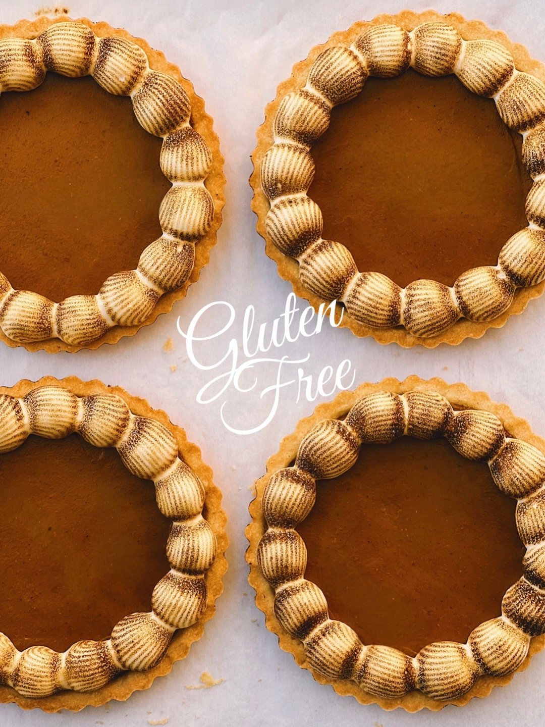 - One 8-inch gluten free pumpkin pie. Gluten free almond sablé tart shell, spiced pumpkin filling, vanilla bean whipped cream.